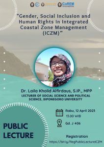 Pada Rabu, 12 April 2023, telah diselenggarakan kuliah umum bertajuk “Gender, Social Inclusion and Human Rights in Integrated Coastal Zone Management (ICZM)” di Gedung J 406, FPIK UNDIP. Acara ini menghadirkan narasumber Dr. Laila Kholid Alfirdaus, S.IP., MPP, dari Fakultas Ilmu Sosial dan Ilmu Politik, Universitas Diponegoro.
